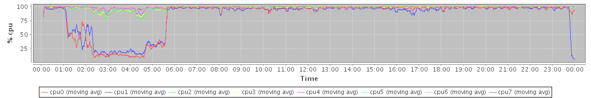 avg(cpu0) = 9.47 avg(cpu1) = 10.18 avg(cpu2) = 0.66 avg(cpu3) = 0.64 avg(cpu4) = 0.33 avg(cpu5) = 0.31 avg(cpu6) = 0.20 avg(cpu7) = 0.13