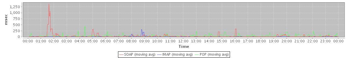 max(GetMsgRequest) = 10.00 max(GetMiniCalRequest) = 22.00 max(GetItemRequest) = 313.00 max(SearchConvRequest) = 10.00 max(SearchRequest) = 58.00 max(GetFolderRequest) = 21.00 max(NoOpRequest) = 26.00 max(GetEffectiveFolderPermsRequest) = 42.00 max(MsgActionRequest.trash) = 10.00 max(GetDomainInfoRequest) = 11.00