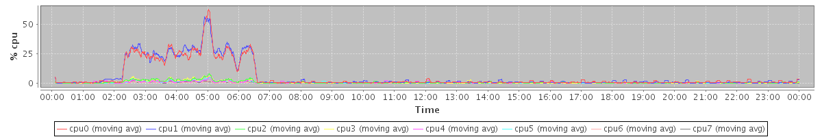 avg(cpu0) = 5.47 avg(cpu1) = 5.76 avg(cpu2) = 0.86 avg(cpu3) = 0.73 avg(cpu4) = 0.65 avg(cpu5) = 0.46 avg(cpu6) = 0.23 avg(cpu7) = 0.22