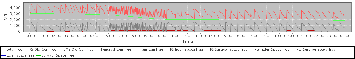 avg(total free) = 3209.16 avg(PS Old Gen free) = 0.00 avg(CMS Old Gen free) = 2302.76 avg(Tenured Gen free) = 0.00 avg(Train Gen free) = 0.00 avg(PS Eden Space free) = 0.00 avg(PS Survivor Space free) = 0.00 avg(Par Eden Space free) = 780.48 avg(Par Survivor Space free) = 125.93 avg(Eden Space free) = 0.00 avg(Survivor Space free) = 0.00