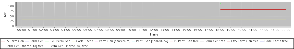 avg(PS Perm Gen) = 0.00 avg(Perm Gen) = 0.00 avg(CMS Perm Gen) = 114.72 avg(Code Cache) = 32.80 avg(Perm Gen [shared-ro]) = 0.00 avg(Perm Gen [shared-rw]) = 0.00 avg(PS Perm Gen free) = 0.00 avg(Perm Gen free) = 0.00 avg(CMS Perm Gen free) = 81.28 avg(Code Cache free) = 0.28 avg(Perm Gen [shared-ro] free) = 0.00 avg(Perm Gen [shared-rw] free) = 0.00