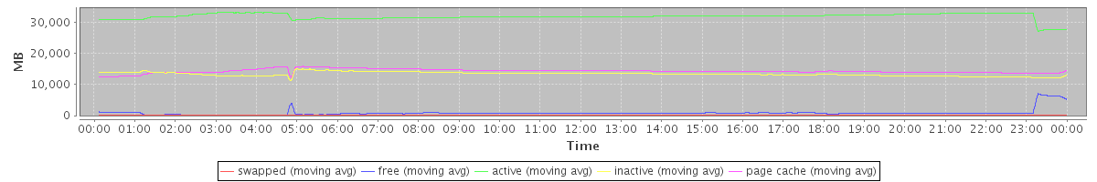 avg(swapped) = 62.42 avg(free) = 895.39 avg(active) = 32004.89 avg(inactive) = 13425.44 avg(page cache) = 14353.52