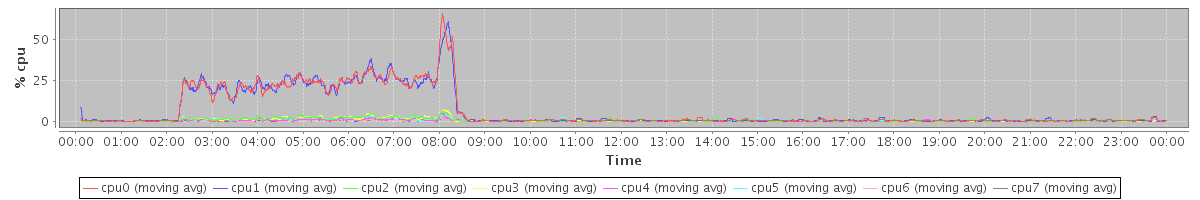 avg(cpu0) = 15.52 avg(cpu1) = 16.55 avg(cpu2) = 0.75 avg(cpu3) = 0.83 avg(cpu4) = 0.29 avg(cpu5) = 0.35 avg(cpu6) = 0.10 avg(cpu7) = 0.10
