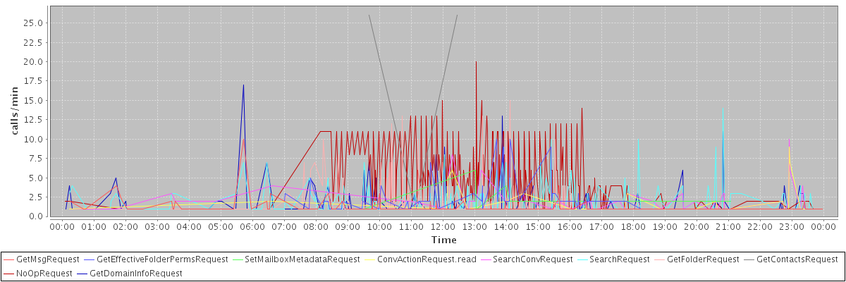 max(GetMsgRequest) = 10.00 max(GetEffectiveFolderPermsRequest) = 10.00 max(SetMailboxMetadataRequest) = 6.00 max(ConvActionRequest.read) = 9.00 max(SearchConvRequest) = 10.00 max(SearchRequest) = 14.00 max(GetFolderRequest) = 15.00 max(GetContactsRequest) = 26.00 max(NoOpRequest) = 20.00 max(GetDomainInfoRequest) = 17.00
