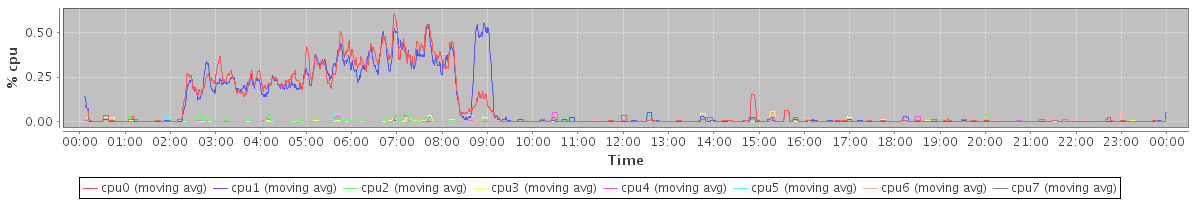 avg(cpu0) = 0.63 avg(cpu1) = 0.61 avg(cpu2) = 0.26 avg(cpu3) = 0.26 avg(cpu4) = 0.17 avg(cpu5) = 0.14 avg(cpu6) = 0.12 avg(cpu7) = 0.10