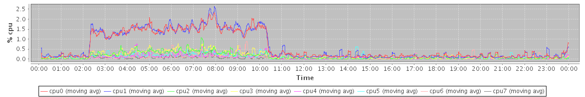 avg(cpu0) = 9.11 avg(cpu1) = 9.50 avg(cpu2) = 0.84 avg(cpu3) = 0.85 avg(cpu4) = 0.45 avg(cpu5) = 0.44 avg(cpu6) = 0.31 avg(cpu7) = 0.22