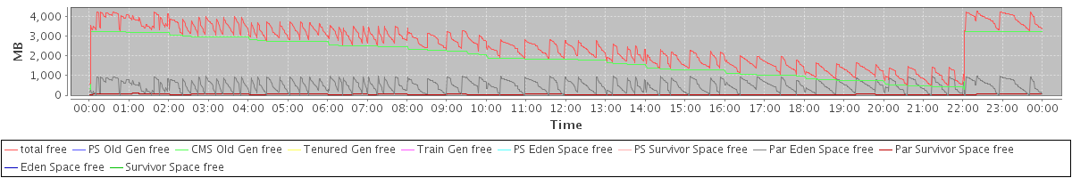 avg(total free) = 2549.14 avg(PS Old Gen free) = 0.00 avg(CMS Old Gen free) = 2004.73 avg(Tenured Gen free) = 0.00 avg(Train Gen free) = 0.00 avg(PS Eden Space free) = 0.00 avg(PS Survivor Space free) = 0.00 avg(Par Eden Space free) = 505.21 avg(Par Survivor Space free) = 39.20 avg(Eden Space free) = 0.00 avg(Survivor Space free) = 0.00