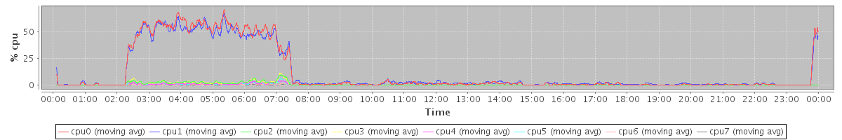 avg(cpu0) = 12.31 avg(cpu1) = 12.08 avg(cpu2) = 0.65 avg(cpu3) = 0.65 avg(cpu4) = 0.30 avg(cpu5) = 0.26 avg(cpu6) = 0.11 avg(cpu7) = 0.08