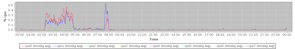 avg(cpu0) = 0.31 avg(cpu1) = 0.35 avg(cpu2) = 0.11 avg(cpu3) = 0.09 avg(cpu4) = 0.05 avg(cpu5) = 0.06 avg(cpu6) = 0.07 avg(cpu7) = 0.03