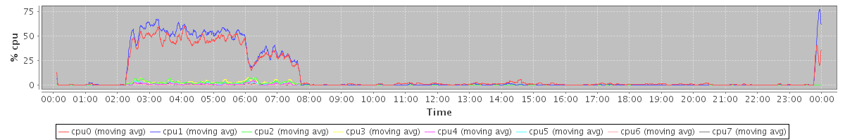avg(cpu0) = 10.20 avg(cpu1) = 11.28 avg(cpu2) = 0.67 avg(cpu3) = 0.75 avg(cpu4) = 0.28 avg(cpu5) = 0.37 avg(cpu6) = 0.09 avg(cpu7) = 0.17