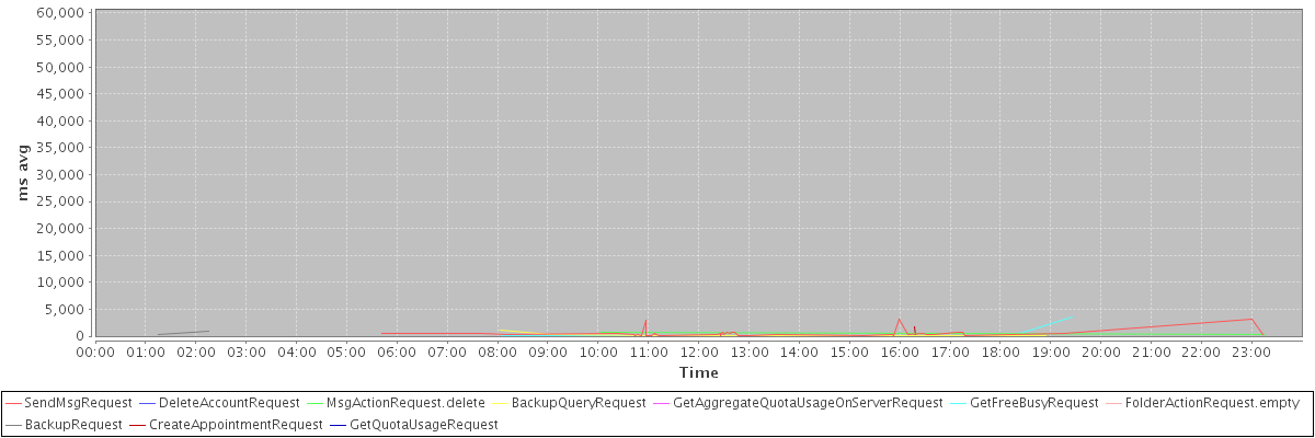 avg(SendMsgRequest) = 513.83 avg(DeleteAccountRequest) = 57908.00 avg(MsgActionRequest.delete) = 487.50 avg(BackupQueryRequest) = 314.33 avg(GetAggregateQuotaUsageOnServerRequest) = 1192.00 avg(GetFreeBusyRequest) = 279.20 avg(FolderActionRequest.empty) = 990.00 avg(BackupRequest) = 632.00 avg(CreateAppointmentRequest) = 729.33 avg(GetQuotaUsageRequest) = 1685.00