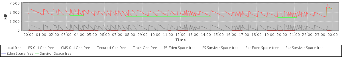 avg(total free) = 4774.06 avg(PS Old Gen free) = 0.00 avg(CMS Old Gen free) = 3906.58 avg(Tenured Gen free) = 0.00 avg(Train Gen free) = 0.00 avg(PS Eden Space free) = 0.00 avg(PS Survivor Space free) = 0.00 avg(Par Eden Space free) = 780.13 avg(Par Survivor Space free) = 87.35 avg(Eden Space free) = 0.00 avg(Survivor Space free) = 0.00