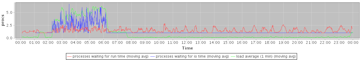 avg(processes waiting for run time) = 0.73 avg(processes waiting for io time) = 0.52 avg(load average (1 min)) = 1.01