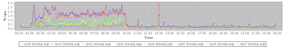 avg(cpu0) = 10.69 avg(cpu1) = 11.36 avg(cpu2) = 1.67 avg(cpu3) = 1.88 avg(cpu4) = 1.05 avg(cpu5) = 1.11 avg(cpu6) = 0.55 avg(cpu7) = 0.79