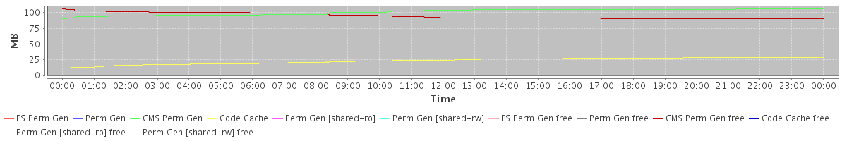 avg(PS Perm Gen) = 0.00 avg(Perm Gen) = 0.00 avg(CMS Perm Gen) = 101.14 avg(Code Cache) = 23.36 avg(Perm Gen [shared-ro]) = 0.00 avg(Perm Gen [shared-rw]) = 0.00 avg(PS Perm Gen free) = 0.00 avg(Perm Gen free) = 0.00 avg(CMS Perm Gen free) = 94.86 avg(Code Cache free) = 0.28 avg(Perm Gen [shared-ro] free) = 0.00 avg(Perm Gen [shared-rw] free) = 0.00
