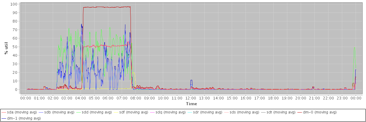 avg(sda) = 8.00 avg(sdb) = 5.71 avg(sdd) = 10.59 avg(sdf) = 0.47 avg(sdq) = 8.01 avg(sdr) = 5.72 avg(sds) = 10.61 avg(sdt) = 0.48 avg(dm-0) = 15.05 avg(dm-1) = 6.39