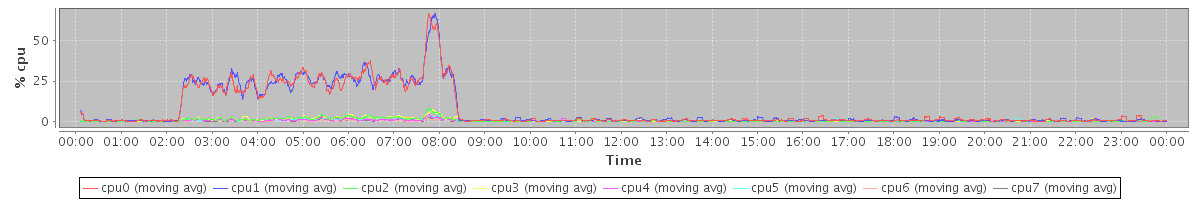 avg(cpu0) = 12.13 avg(cpu1) = 14.52 avg(cpu2) = 0.69 avg(cpu3) = 0.71 avg(cpu4) = 0.26 avg(cpu5) = 0.30 avg(cpu6) = 0.08 avg(cpu7) = 0.13