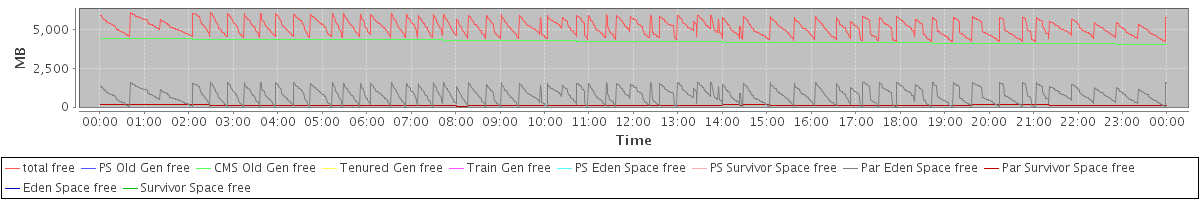 avg(total free) = 5170.99 avg(PS Old Gen free) = 0.00 avg(CMS Old Gen free) = 4254.40 avg(Tenured Gen free) = 0.00 avg(Train Gen free) = 0.00 avg(PS Eden Space free) = 0.00 avg(PS Survivor Space free) = 0.00 avg(Par Eden Space free) = 801.37 avg(Par Survivor Space free) = 115.22 avg(Eden Space free) = 0.00 avg(Survivor Space free) = 0.00