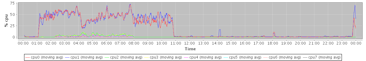avg(cpu0) = 18.56 avg(cpu1) = 19.31 avg(cpu2) = 0.95 avg(cpu3) = 0.94 avg(cpu4) = 0.48 avg(cpu5) = 0.44 avg(cpu6) = 0.14 avg(cpu7) = 0.16