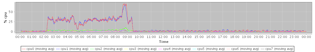 avg(cpu0) = 0.67 avg(cpu1) = 0.66 avg(cpu2) = 0.25 avg(cpu3) = 0.25 avg(cpu4) = 0.15 avg(cpu5) = 0.15 avg(cpu6) = 0.12 avg(cpu7) = 0.09