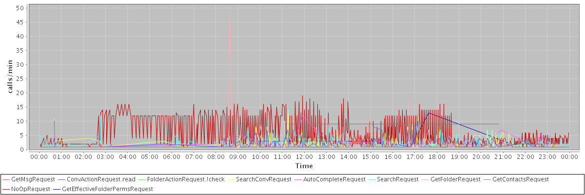 max(GetMsgRequest) = 10.00 max(ConvActionRequest.read) = 10.00 max(FolderActionRequest.!check) = 9.00 max(SearchConvRequest) = 14.00 max(AutoCompleteRequest) = 12.00 max(SearchRequest) = 14.00 max(GetFolderRequest) = 49.00 max(GetContactsRequest) = 9.00 max(NoOpRequest) = 19.00 max(GetEffectiveFolderPermsRequest) = 13.00