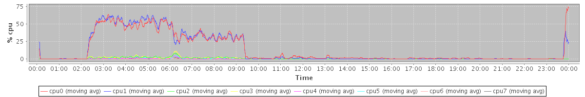avg(cpu0) = 9.21 avg(cpu1) = 9.63 avg(cpu2) = 1.09 avg(cpu3) = 0.93 avg(cpu4) = 0.67 avg(cpu5) = 0.58 avg(cpu6) = 0.29 avg(cpu7) = 0.28