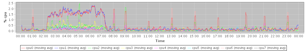 avg(cpu0) = 0.07 avg(cpu1) = 0.07 avg(cpu2) = 0.01 avg(cpu3) = 0.00 avg(cpu4) = 0.01 avg(cpu5) = 0.00 avg(cpu6) = 0.01 avg(cpu7) = 0.00