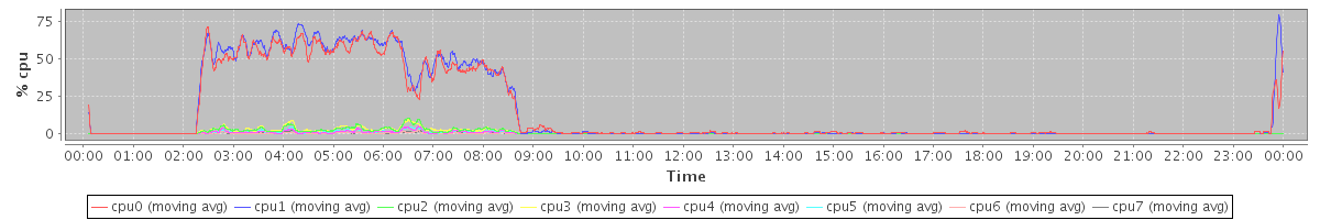 avg(cpu0) = 14.54 avg(cpu1) = 15.18 avg(cpu2) = 0.81 avg(cpu3) = 0.87 avg(cpu4) = 0.35 avg(cpu5) = 0.40 avg(cpu6) = 0.10 avg(cpu7) = 0.16