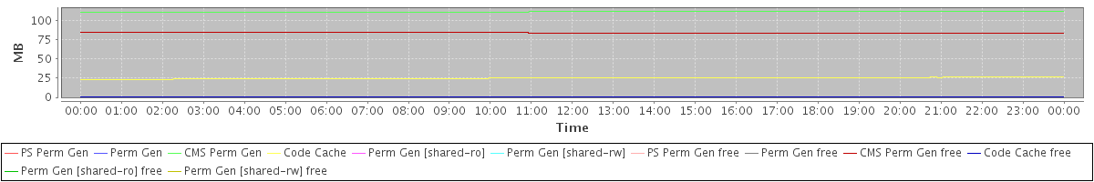 avg(PS Perm Gen) = 0.00 avg(Perm Gen) = 0.00 avg(CMS Perm Gen) = 111.69 avg(Code Cache) = 25.13 avg(Perm Gen [shared-ro]) = 0.00 avg(Perm Gen [shared-rw]) = 0.00 avg(PS Perm Gen free) = 0.00 avg(Perm Gen free) = 0.00 avg(CMS Perm Gen free) = 84.31 avg(Code Cache free) = 0.27 avg(Perm Gen [shared-ro] free) = 0.00 avg(Perm Gen [shared-rw] free) = 0.00