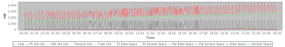 avg(total) = 2887.76 avg(PS Old Gen) = 0.00 avg(CMS Old Gen) = 1991.02 avg(Tenured Gen) = 0.00 avg(Train Gen) = 0.00 avg(PS Eden Space) = 0.00 avg(PS Survivor Space) = 0.00 avg(Par Eden Space) = 809.13 avg(Par Survivor Space) = 87.60 avg(Eden Space) = 0.00 avg(Survivor Space) = 0.00