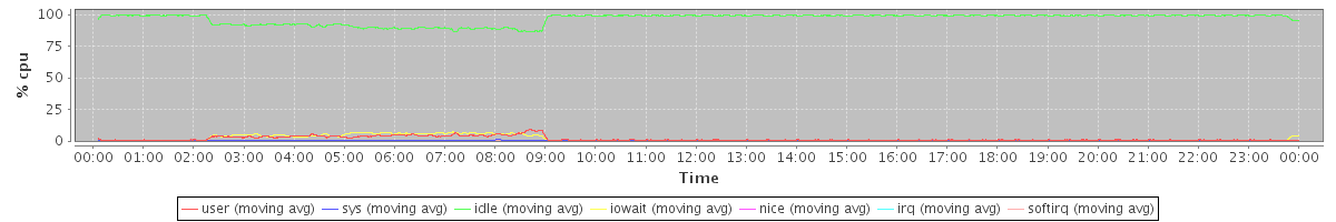 avg(user) = 1.66 avg(sys) = 0.22 avg(idle) = 96.57 avg(iowait) = 1.52 avg(nice) = 0.00 avg(irq) = 0.00 avg(softirq) = 0.00