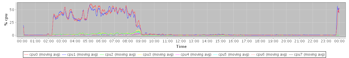 avg(cpu0) = 9.80 avg(cpu1) = 9.88 avg(cpu2) = 1.56 avg(cpu3) = 1.50 avg(cpu4) = 0.80 avg(cpu5) = 0.81 avg(cpu6) = 0.62 avg(cpu7) = 0.49
