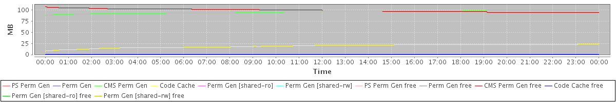 avg(PS Perm Gen) = 0.00 avg(Perm Gen) = 0.00 avg(CMS Perm Gen) = 96.42 avg(Code Cache) = 19.14 avg(Perm Gen [shared-ro]) = 0.00 avg(Perm Gen [shared-rw]) = 0.00 avg(PS Perm Gen free) = 0.00 avg(Perm Gen free) = 0.00 avg(CMS Perm Gen free) = 99.58 avg(Code Cache free) = 0.31 avg(Perm Gen [shared-ro] free) = 0.00 avg(Perm Gen [shared-rw] free) = 0.00