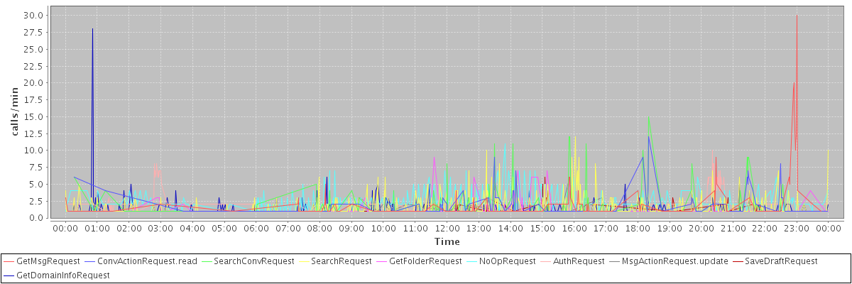 max(GetMsgRequest) = 30.00 max(ConvActionRequest.read) = 12.00 max(SearchConvRequest) = 15.00 max(SearchRequest) = 12.00 max(GetFolderRequest) = 9.00 max(NoOpRequest) = 11.00 max(AuthRequest) = 10.00 max(MsgActionRequest.update) = 6.00 max(SaveDraftRequest) = 6.00 max(GetDomainInfoRequest) = 28.00