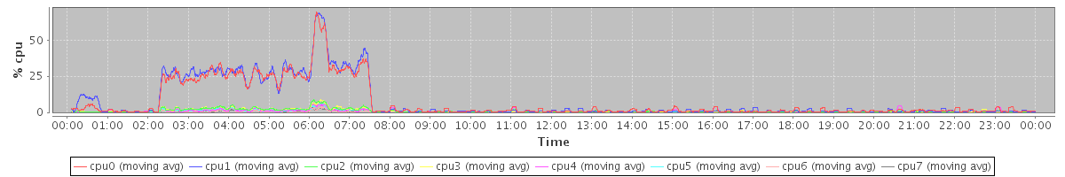 avg(cpu0) = 7.14 avg(cpu1) = 7.53 avg(cpu2) = 0.94 avg(cpu3) = 0.84 avg(cpu4) = 0.70 avg(cpu5) = 0.49 avg(cpu6) = 0.28 avg(cpu7) = 0.27