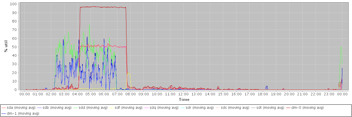 avg(sda) = 8.09 avg(sdb) = 4.47 avg(sdd) = 8.75 avg(sdf) = 0.47 avg(sdq) = 8.12 avg(sdr) = 4.47 avg(sds) = 8.76 avg(sdt) = 0.47 avg(dm-0) = 15.31 avg(dm-1) = 5.04