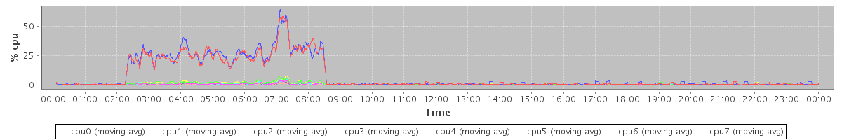 avg(cpu0) = 7.50 avg(cpu1) = 7.94 avg(cpu2) = 0.79 avg(cpu3) = 0.79 avg(cpu4) = 0.39 avg(cpu5) = 0.47 avg(cpu6) = 0.33 avg(cpu7) = 0.22