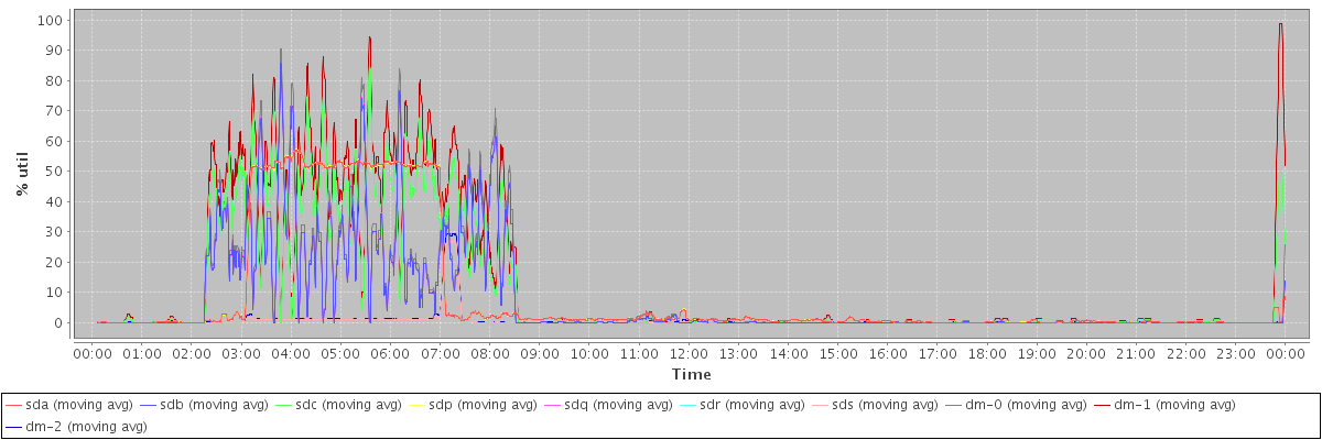 avg(sda) = 9.22 avg(sdb) = 7.64 avg(sdc) = 10.62 avg(sdp) = 9.23 avg(sdq) = 7.65 avg(sdr) = 10.62 avg(sds) = 0.59 avg(dm-0) = 8.41 avg(dm-1) = 13.01 avg(dm-2) = 0.69