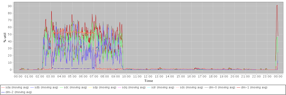 avg(sda) = 9.51 avg(sdb) = 8.95 avg(sdc) = 12.05 avg(sdp) = 9.52 avg(sdq) = 8.96 avg(sdr) = 12.05 avg(sds) = 0.63 avg(dm-0) = 9.84 avg(dm-1) = 14.82 avg(dm-2) = 0.73