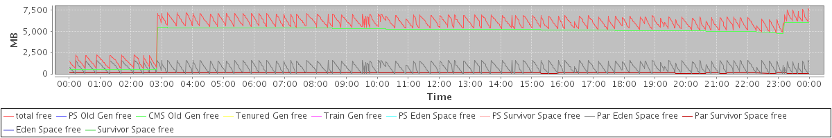 avg(total free) = 5564.91 avg(PS Old Gen free) = 0.00 avg(CMS Old Gen free) = 4672.26 avg(Tenured Gen free) = 0.00 avg(Train Gen free) = 0.00 avg(PS Eden Space free) = 0.00 avg(PS Survivor Space free) = 0.00 avg(Par Eden Space free) = 785.30 avg(Par Survivor Space free) = 107.34 avg(Eden Space free) = 0.00 avg(Survivor Space free) = 0.00