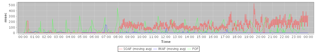avg(DismissCalendarItemAlarmRequest) = 70.75 avg(AutoCompleteRequest) = 320.82 avg(SendMsgRequest) = 654.60 avg(SearchGalRequest) = 46.00 avg(BackupQueryRequest) = 415.00 avg(GetAggregateQuotaUsageOnServerRequest) = 840.00 avg(GetFreeBusyRequest) = 369.46 avg(SaveDraftRequest) = 54.41 avg(CheckSpellingRequest) = 131.50 avg(GetQuotaUsageRequest) = 1209.00