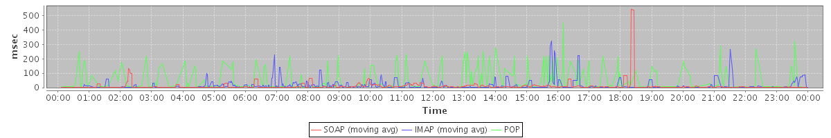 avg(BackupQueryRequest) = 242.83 avg(GetAggregateQuotaUsageOnServerRequest) = 988.00 avg(ICalReplyRequest) = 578.00 avg(SendInviteReplyRequest) = 426.50 avg(AutoCompleteRequest) = 151.69 avg(BackupRequest) = 1324.50 avg(SendMsgRequest) = 695.63 avg(SaveDraftRequest) = 89.58 avg(GetQuotaUsageRequest) = 1107.00 avg(SearchGalRequest) = 32.12