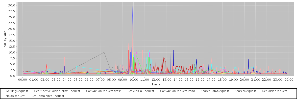 max(GetMsgRequest) = 11.00 max(GetEffectiveFolderPermsRequest) = 30.00 max(ConvActionRequest.trash) = 11.00 max(GetMiniCalRequest) = 11.00 max(ConvActionRequest.read) = 12.00 max(SearchConvRequest) = 12.00 max(SearchRequest) = 23.00 max(GetFolderRequest) = 10.00 max(NoOpRequest) = 8.00 max(GetDomainInfoRequest) = 11.00