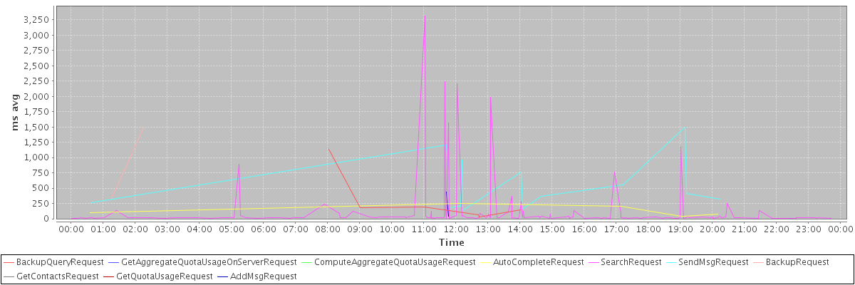 avg(BackupQueryRequest) = 289.83 avg(GetAggregateQuotaUsageOnServerRequest) = 1287.00 avg(ComputeAggregateQuotaUsageRequest) = 2042.00 avg(AutoCompleteRequest) = 119.00 avg(SearchRequest) = 115.95 avg(SendMsgRequest) = 557.93 avg(BackupRequest) = 903.50 avg(GetContactsRequest) = 171.00 avg(GetQuotaUsageRequest) = 1269.00 avg(AddMsgRequest) = 241.50