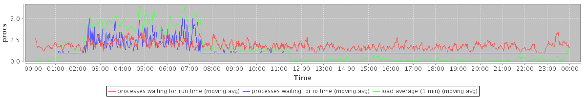 avg(processes waiting for run time) = 1.29 avg(processes waiting for io time) = 0.72 avg(load average (1 min)) = 1.40