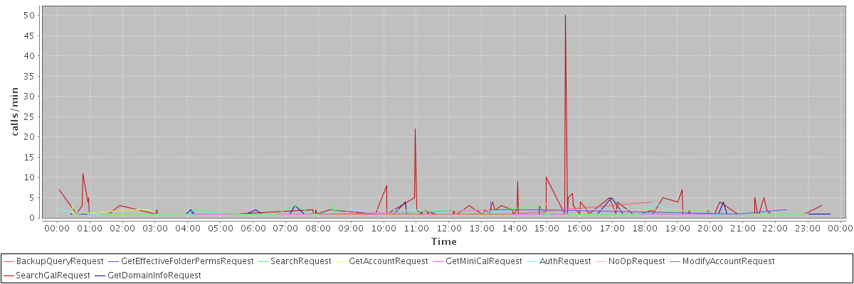 max(BackupQueryRequest) = 4.00 max(GetEffectiveFolderPermsRequest) = 4.00 max(SearchRequest) = 3.00 max(GetAccountRequest) = 3.00 max(GetMiniCalRequest) = 2.00 max(AuthRequest) = 4.00 max(NoOpRequest) = 4.00 max(ModifyAccountRequest) = 3.00 max(SearchGalRequest) = 50.00 max(GetDomainInfoRequest) = 5.00