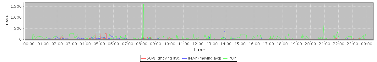 avg(BackupQueryRequest) = 333.60 avg(GetAggregateQuotaUsageOnServerRequest) = 1034.00 avg(GetFreeBusyRequest) = 2287.00 avg(SearchConvRequest) = 57.00 avg(AutoCompleteRequest) = 218.00 avg(SearchRequest) = 34.79 avg(SendMsgRequest) = 1172.00 avg(BackupRequest) = 1134.00 avg(SaveDraftRequest) = 35.00 avg(GetQuotaUsageRequest) = 1252.00
