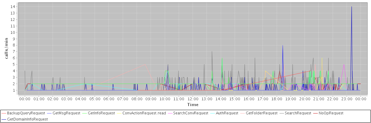 max(BackupQueryRequest) = 4.00 max(GetMsgRequest) = 8.00 max(GetInfoRequest) = 6.00 max(ConvActionRequest.read) = 6.00 max(SearchConvRequest) = 6.00 max(AuthRequest) = 6.00 max(GetFolderRequest) = 5.00 max(SearchRequest) = 7.00 max(NoOpRequest) = 4.00 max(GetDomainInfoRequest) = 14.00