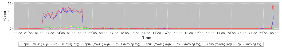 avg(cpu0) = 0.35 avg(cpu1) = 0.35 avg(cpu2) = 0.13 avg(cpu3) = 0.10 avg(cpu4) = 0.06 avg(cpu5) = 0.10 avg(cpu6) = 0.08 avg(cpu7) = 0.04