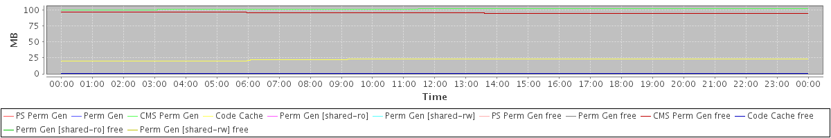 avg(PS Perm Gen) = 0.00 avg(Perm Gen) = 0.00 avg(CMS Perm Gen) = 100.97 avg(Code Cache) = 22.33 avg(Perm Gen [shared-ro]) = 0.00 avg(Perm Gen [shared-rw]) = 0.00 avg(PS Perm Gen free) = 0.00 avg(Perm Gen free) = 0.00 avg(CMS Perm Gen free) = 95.03 avg(Code Cache free) = 0.30 avg(Perm Gen [shared-ro] free) = 0.00 avg(Perm Gen [shared-rw] free) = 0.00